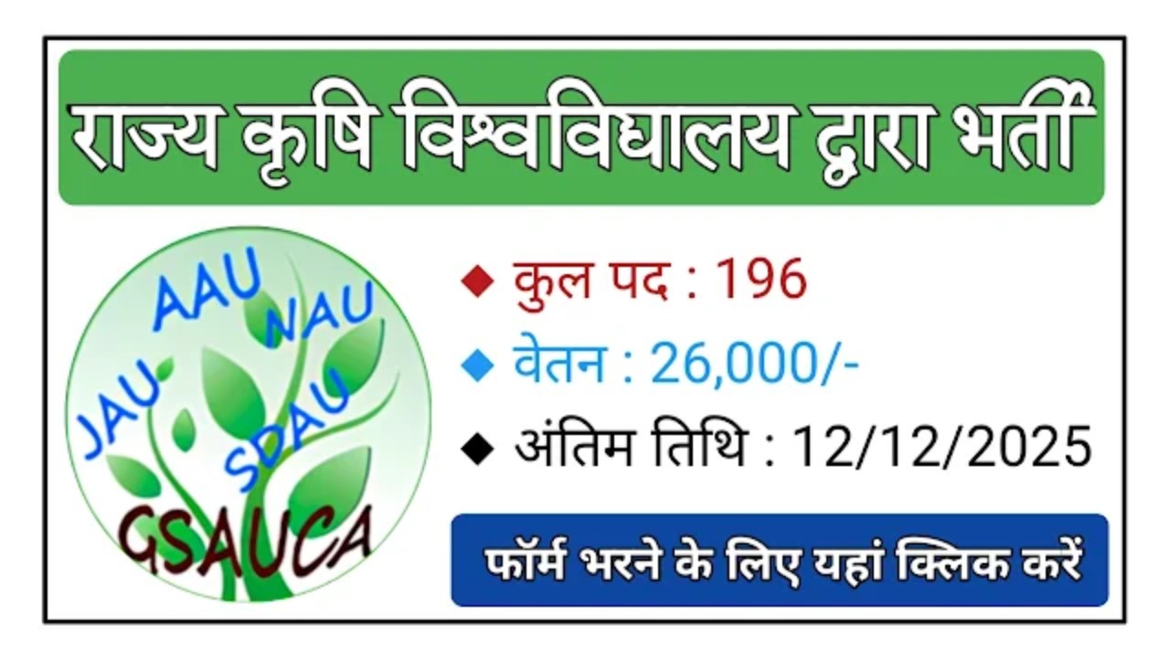 Gujarat State Agricultural Universities Recruitment 2025: (AAU, JAU, NAU,) Have Officially Released Notification For 196 Vacancy, Post Name, Farming Assistant, Advertisement No.: 04/2025, Last Date To Application For 12/12/2025, ou Will Have To Visit The Websites of Junagadh Agricultural University (www.jau.in), Anand Agricultural University (www.aau.in), Navsari Agricultural University (www.nau.in) The Online Application Process, Recruitment Details, Educational Qualification, Age Limit, Salary Structure, Selection Process, Application Steps, And Direct Links To The Official Notification And Application Form.